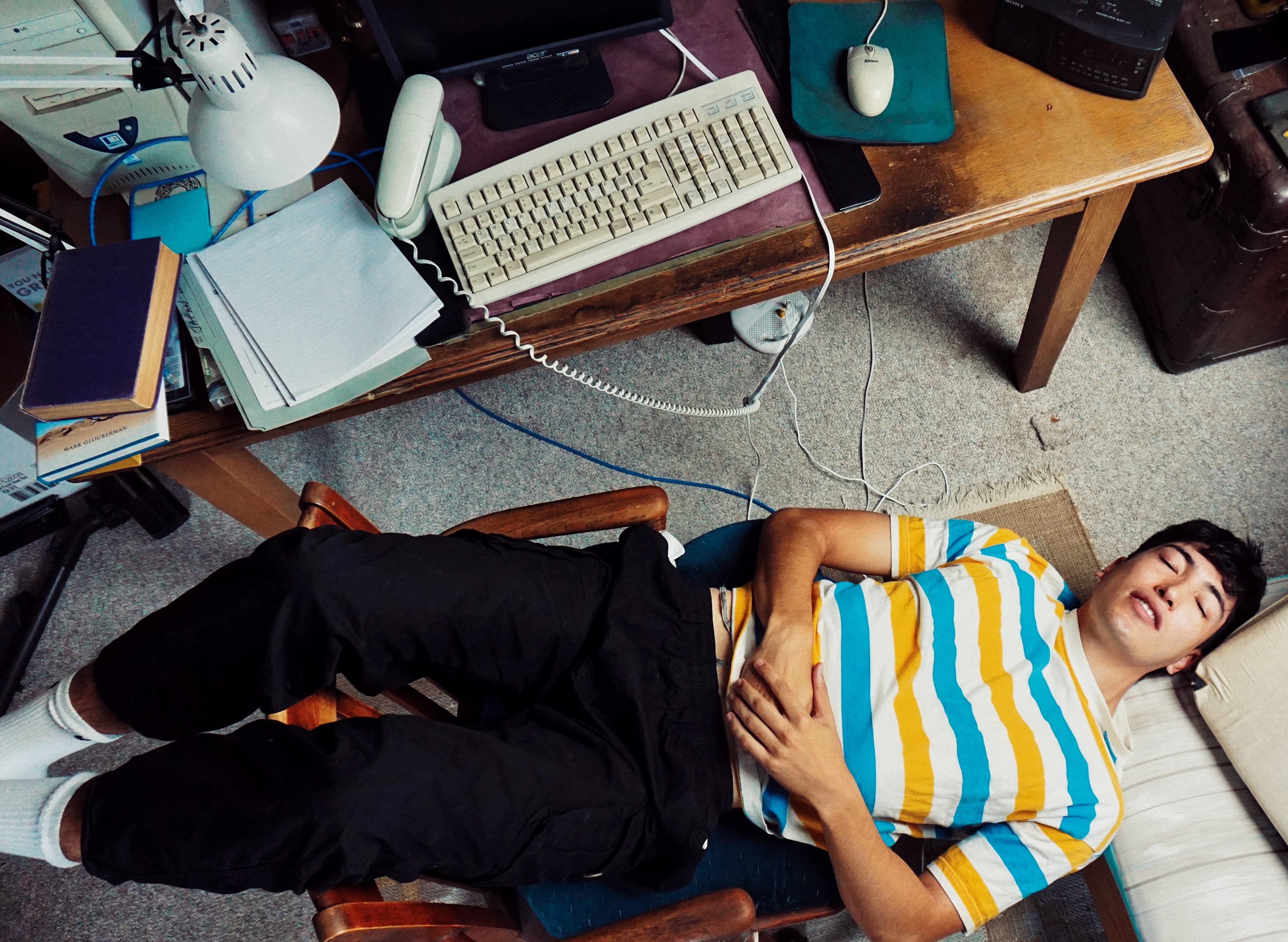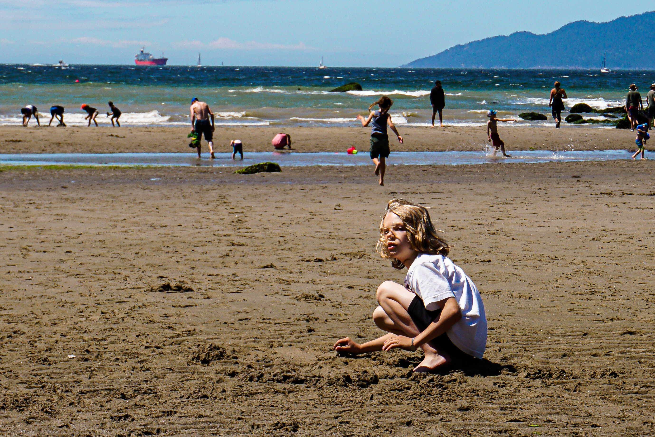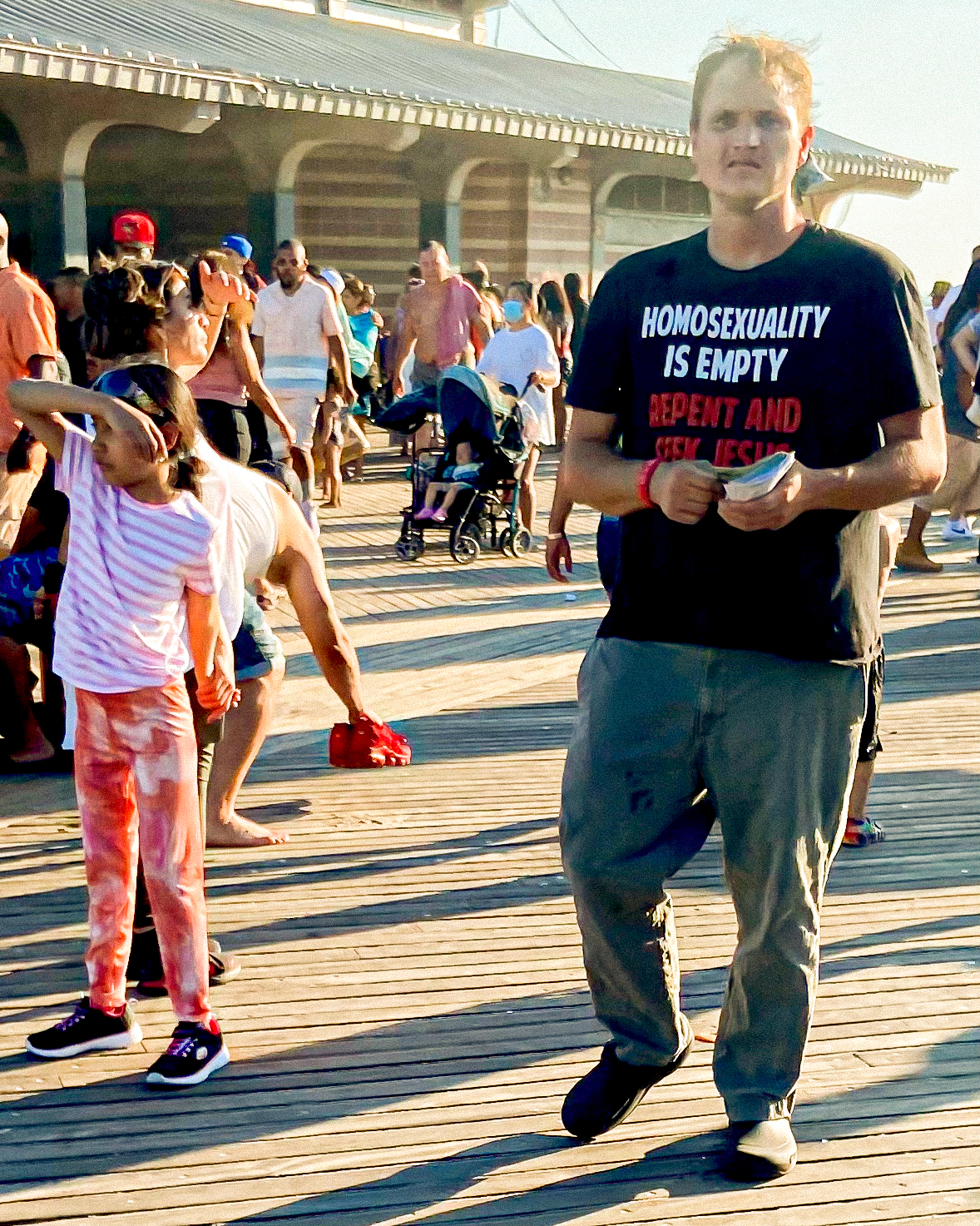 A middle-aged woman worships the sun on a park bench; a young boy in isolation on a crowded beach plays with sand; three figures outside a market watch catastrophe unfold while another is unaware - each image [...] features colourful and quiet moments of everyday life suspended in frames shaped by [his] subconscious.