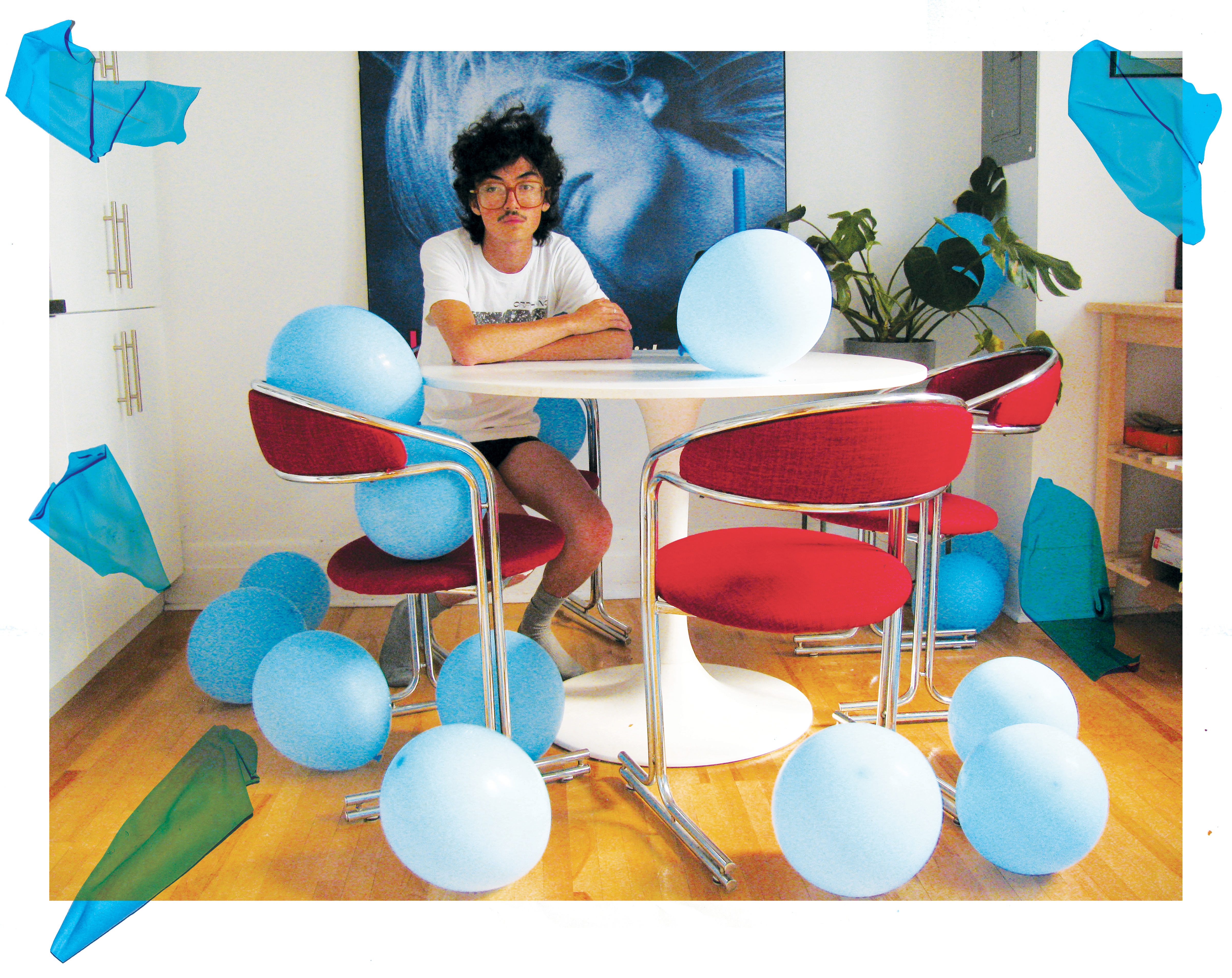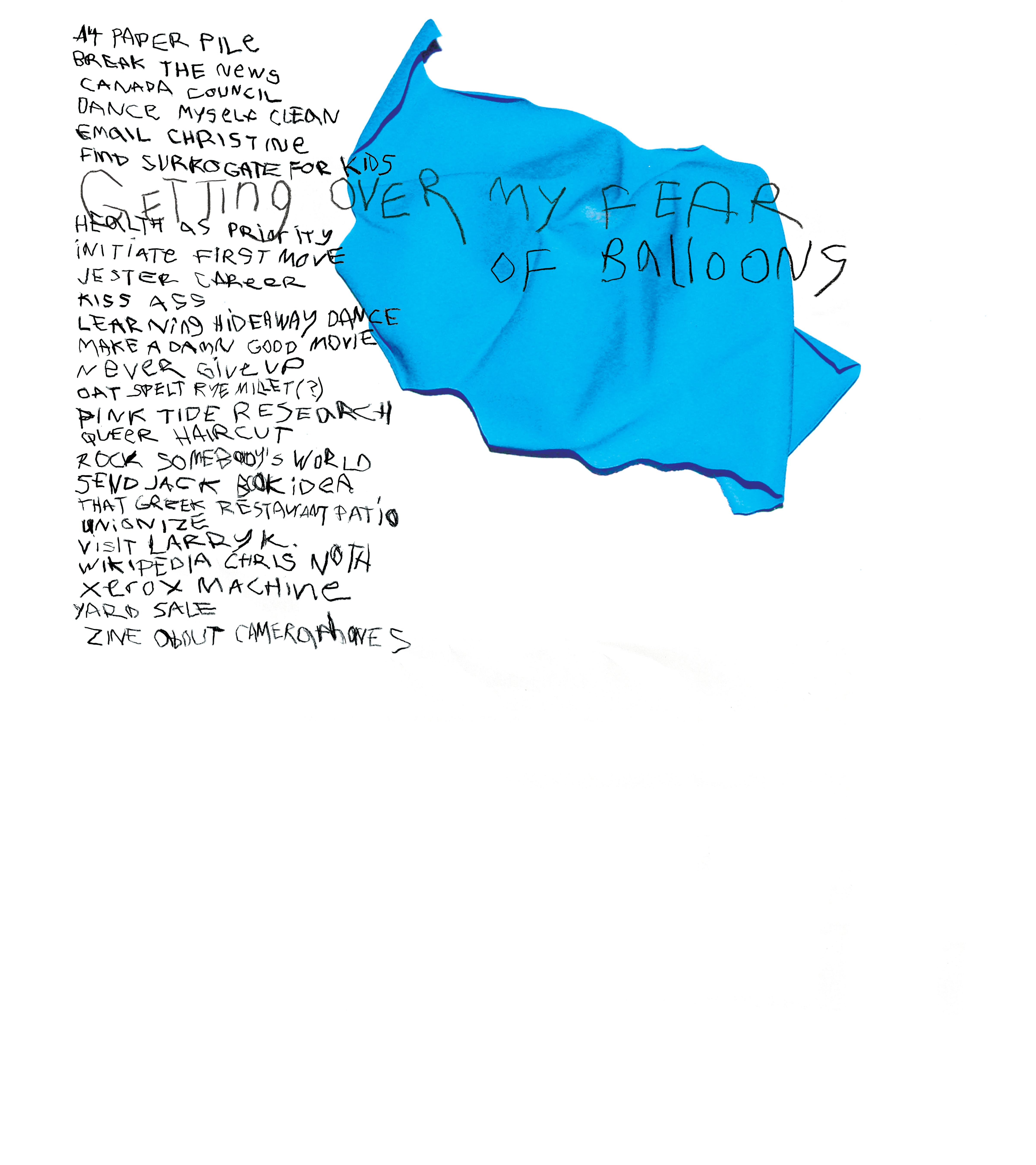 Originally conceived as a “donut letter” mailed to New York-based skateboarding magazine Lilypad, and subsequently exhibited at Waste Space in London, United Kingdom, this self portrait pays tribute to my fear of balloons, which has persisted since childhood. My desire to get over the fear is part of an alphabetical laundry list of twenty six tasks I wished to complete in my twenty fourth year. After photographing this self-portrait, I filmed a video of myself wielding a kitchen knife and popping each balloon despite my fear.