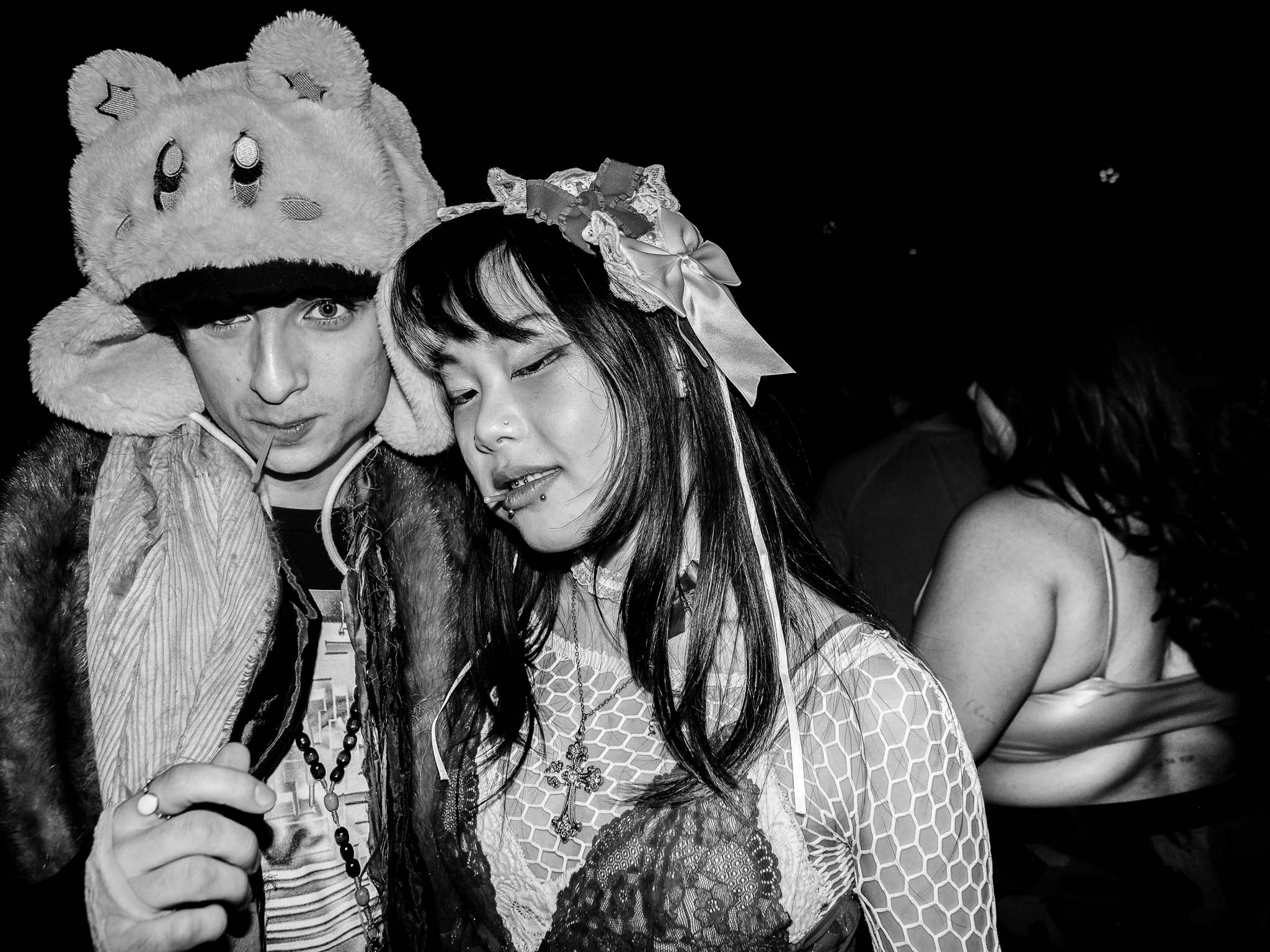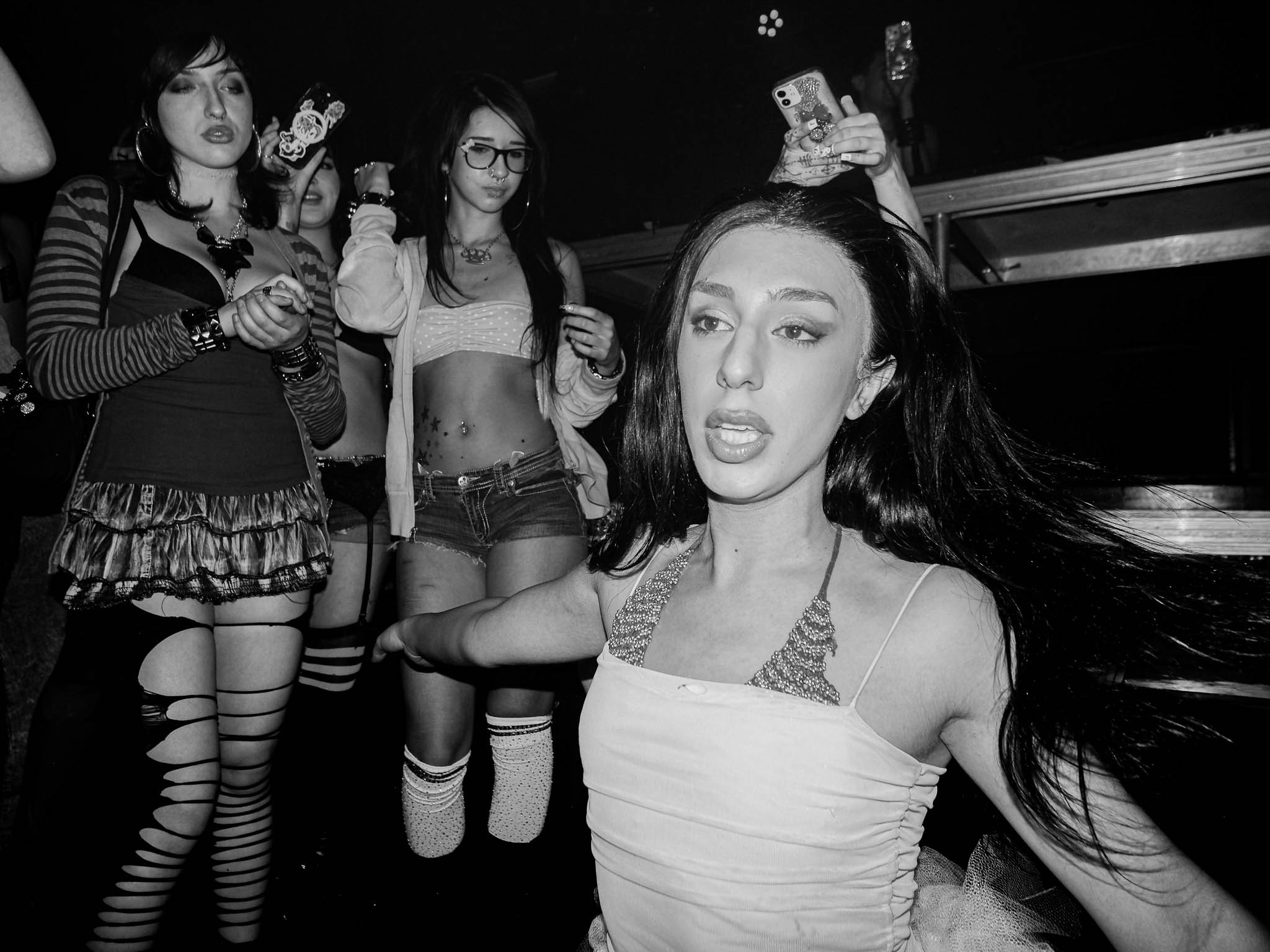 LX: I really am. I started taking photographs when I was a teenager and I have always been really attracted to people and strangers especially. Even though secretly I am very socially anxious. I love people, especially old people, though by this time of night they’ve all gone to bed and are dreaming of peanuts or something. A nightlife setting like Hauterageous is so rich with other different kinds of people though, and each night is a microcosm. TikTok goths, Rageface-era emos, IG clout monsters, indie sleaze ‘revival’-ists, drag queens, Toronto mans, baddies, perverts, straight guys in Aviators on ecstacy, and the gays and the dolls, obviously. So, different people, but most are euphoric in the same way, and some are feeling icky in the same way too, waiting all night for a good night kiss that never comes, or thinking to themself, “I can’t make you love me,” or whatever. An idea that cuts through [much of my work] is our private emotions as public matter. I see precisely this unfolding on the dancefloor for hours, where the alchemy exists in individuals embedded with their own meanings, contributing to this larger formation of collective identity. Everyone is dancing, flirting, kissing, and exchanging energy, circulating their emotions, which stick to one another. This process is as old as human interaction, but it's cool to see it happen in real time on a large scale, knowing it's temporary. It’s similar to photography— one moment, the person in front of me is a cipher, and the next, they are a snapshot image ripe with meaning. Maybe the photographic traces of this dance can have some tangible impact when someone is looking at them later, hungover in the outside world.