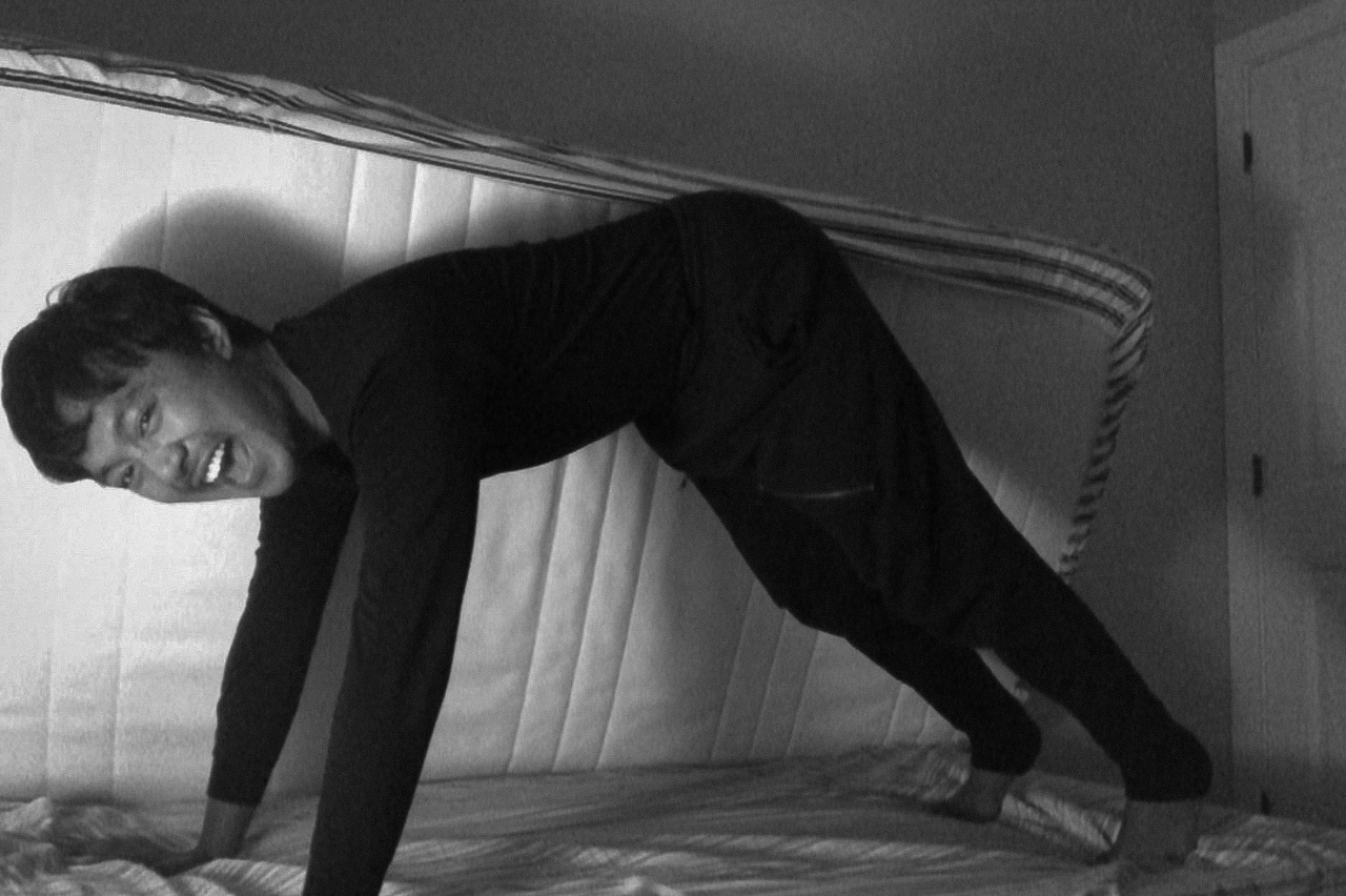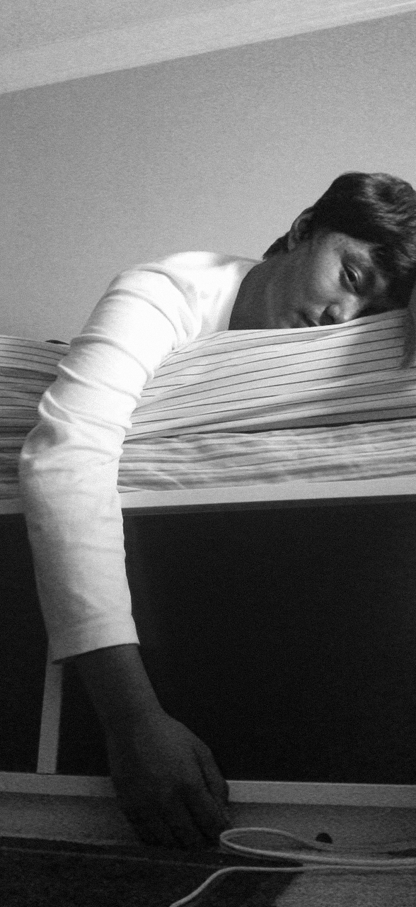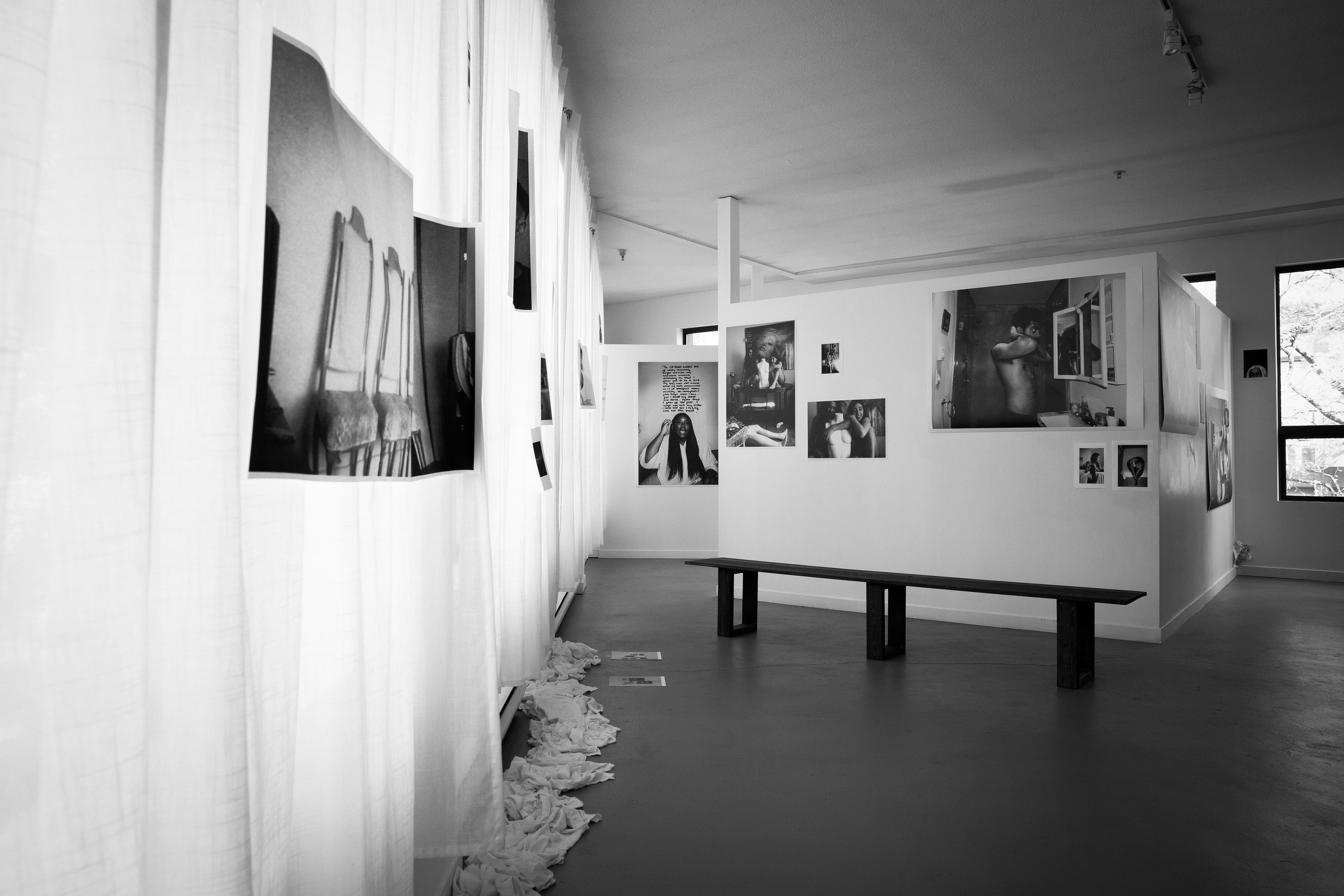 ISO: the exhibition was staged from the 25th to 28th of June 2021 in an empty apartment unit above the Carrall Supermarket in Vancouver. The site-specific installation featured photographs and written excerpts hanging from the walls and curtains, revealing the project ISO. Scraps of white linen were scattered across the floor and stairway, and my personal objects, including books, a film canister containing hair and an empty medicine bottle sat atop the mantelpiece. The visual centrepiece was a bed, constructed from two hundred and seventeen concrete bricks weighing approximately a thousand pounds; each brick was carried up the stairs the evening before by my mother, my brother, my friend, the unit owner and I. The installation also featured three commissioned sound installations by Arlo Spring, emerging from speakers draped in white cloth found throughout the space. Photographed by Donnel Garcia, Aidan & Tina Chin, and Kartik K
